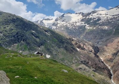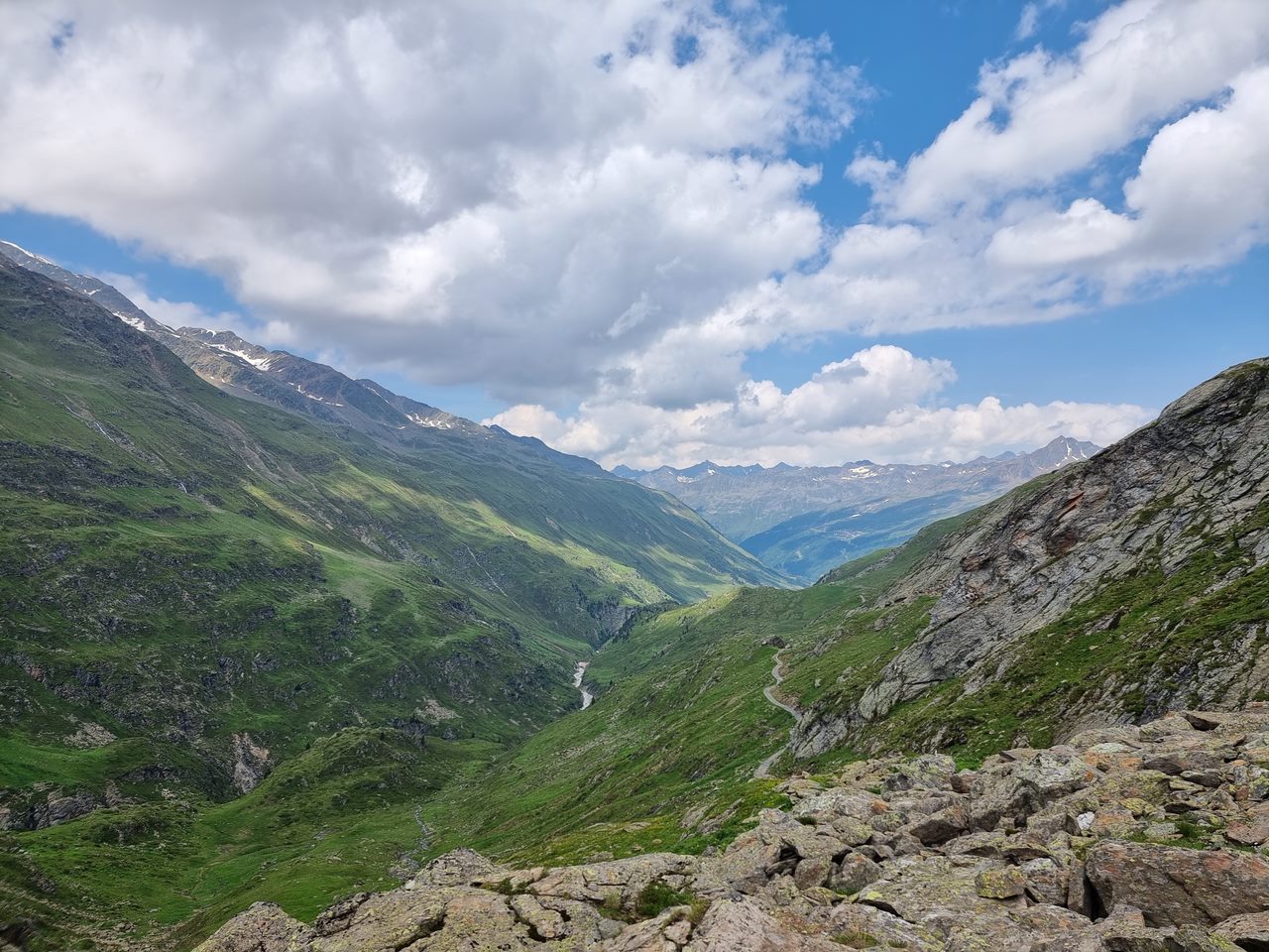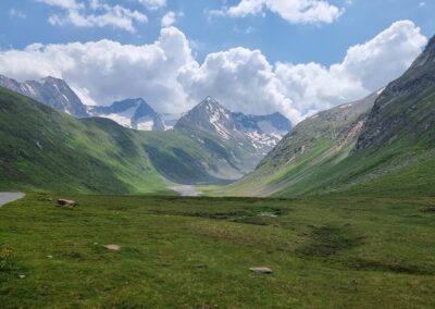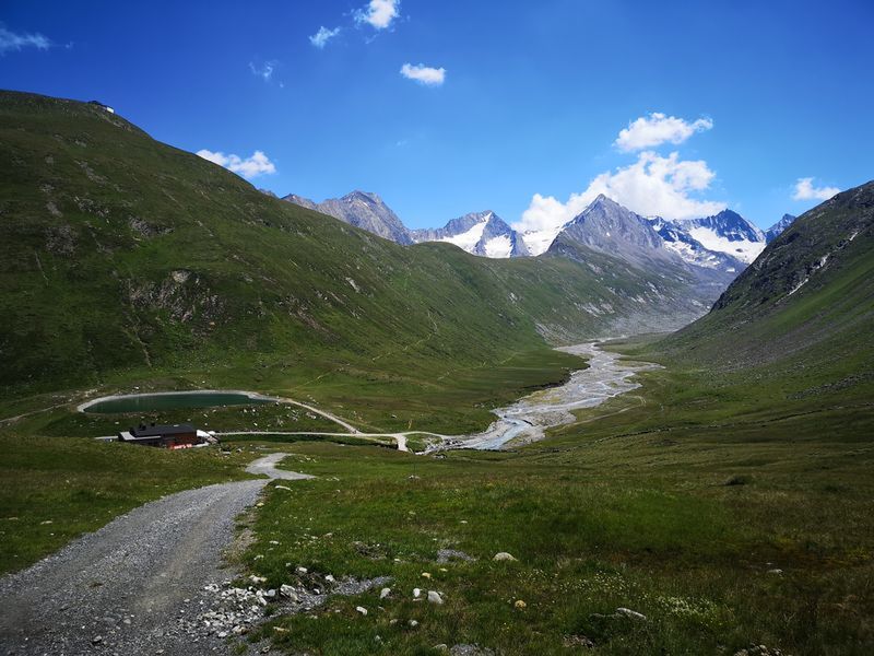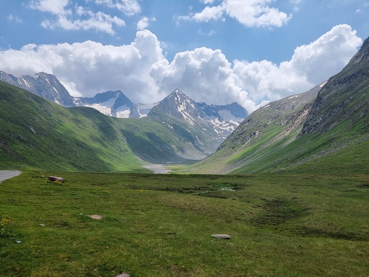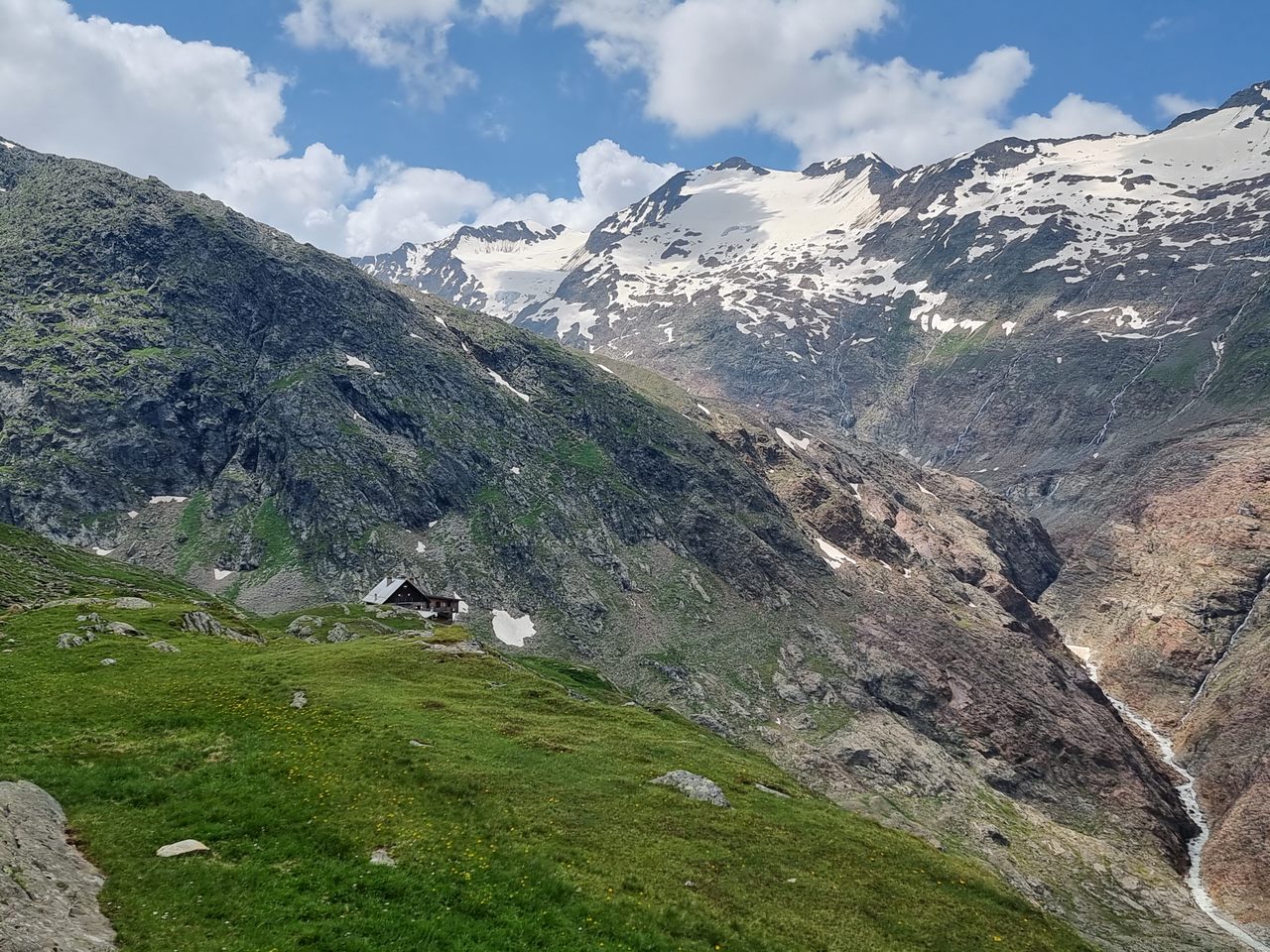 Von der Schönwieshütte treten wir bergauf. Schon bald taucht die Finanzer Hütte am Hang auf. Nach einem kurzen Anstieg erreichen wir sie – und danach geht es leicht abwärts bis zur idyllisch gelegenen Langtalereckhütte, die am Ende des Tals wartet.