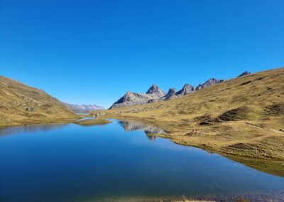 Oben angekommen erwartet uns ein atemberaubender Ausblick am Scheidsee – die Landschaft erinnert fast ein wenig an Kanada oder Alaska. Wer möchte, kann hier die Tour beenden und denselben Weg zurückfahren. Wir aber setzen die Runde fort und fahren hinunter durchs wunderschöne Verwalltal nach St. Anton.